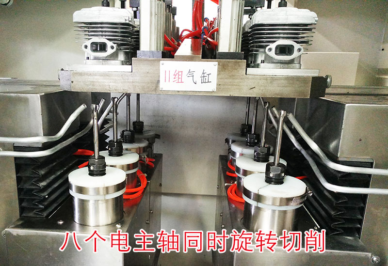 该机床配有七个进给轴、八个电主轴,且进给轴可实现联动,八个电主轴可同时旋转切削。七个进给轴分别为一个X轴、一个Y轴、四个Z轴、一个旋转轴。X、Y、Z轴用于实现进给插补铣削缸体进排气道、扫气道内轮廓线;旋转轴带动回转台,可将待加工缸体旋入加工区,同时将加工完毕的缸体旋出,以实现加工、装卸同时进行。旋转台上面放工件的旋转台,可一次装夹八个工件。装夹时缸体口部向下定向装夹,由气动旋转夹具同时压紧。位于工作台上的八个电主轴同时进给,可实现高速铣削,完成轮廓加工。